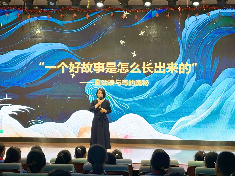 讲座伊始,黄颖曌老师从“什么是童话”切入,指出童话是幻想的艺术,装满爱与温暖,其起源可追溯至盘古开天、女娲造人等古老神话传说。她将故事的诞生比作植物的生长:“长出一棵大树需要种子,长出一个故事也需要种子,这粒种子就是灵感。”她告诉孩子们,灵感大多源于日常生活,观察是积累素材的重要途径,应多从身边事物中发现属于自己的故事种子。
